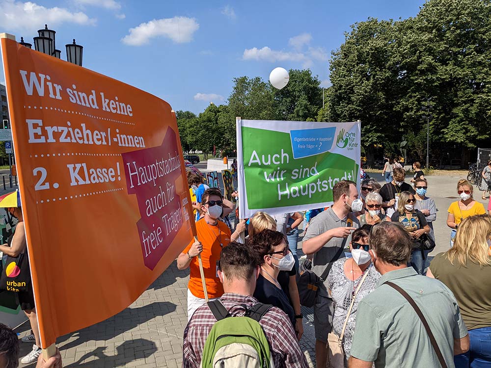 Ist das denn so schlimm, sind das so viele? Die Antwort ist ja. Weit über die Hälfte aller Kitas in Berlin befinden sich in freier Trägerschaft. Die frühkindlichen Bildungsangebote in dieser Stadt werden zu 80 Prozent von Trägern wie Kinder im Kiez getragen. Wir sind einer von vielen Trägern in der Stadt und beschäftigen alleine fast 600 pädagogische Fachkräfte, die sich alle zurecht fragen, warum ihre Arbeit weniger wert sein soll, als die der Kolleginnen und Kollegen in den Eigenbetrieben.